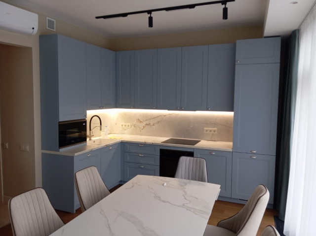 Небесно-голубая кухня с фрезеровкой и диагональными линиями