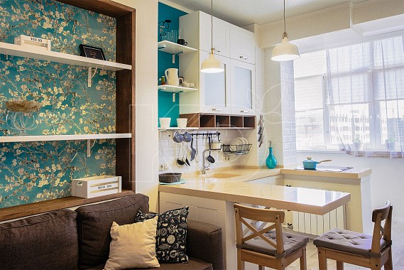 Чтобы выбранная модель максимально гармонично встроилась в интерьер, продумайте дизайн кухонного помещения. Он не должен конфликтовать с концепцией гарнитура. Кухня прованс с барной стойкой не потерпит яркого фона, поэтому откажитесь от идеи декорировать стены обоями с аляповатыми рисунками. Подходящий вариант – полностью однотонные поверхности или с декором в виде мелких растительных узоров.