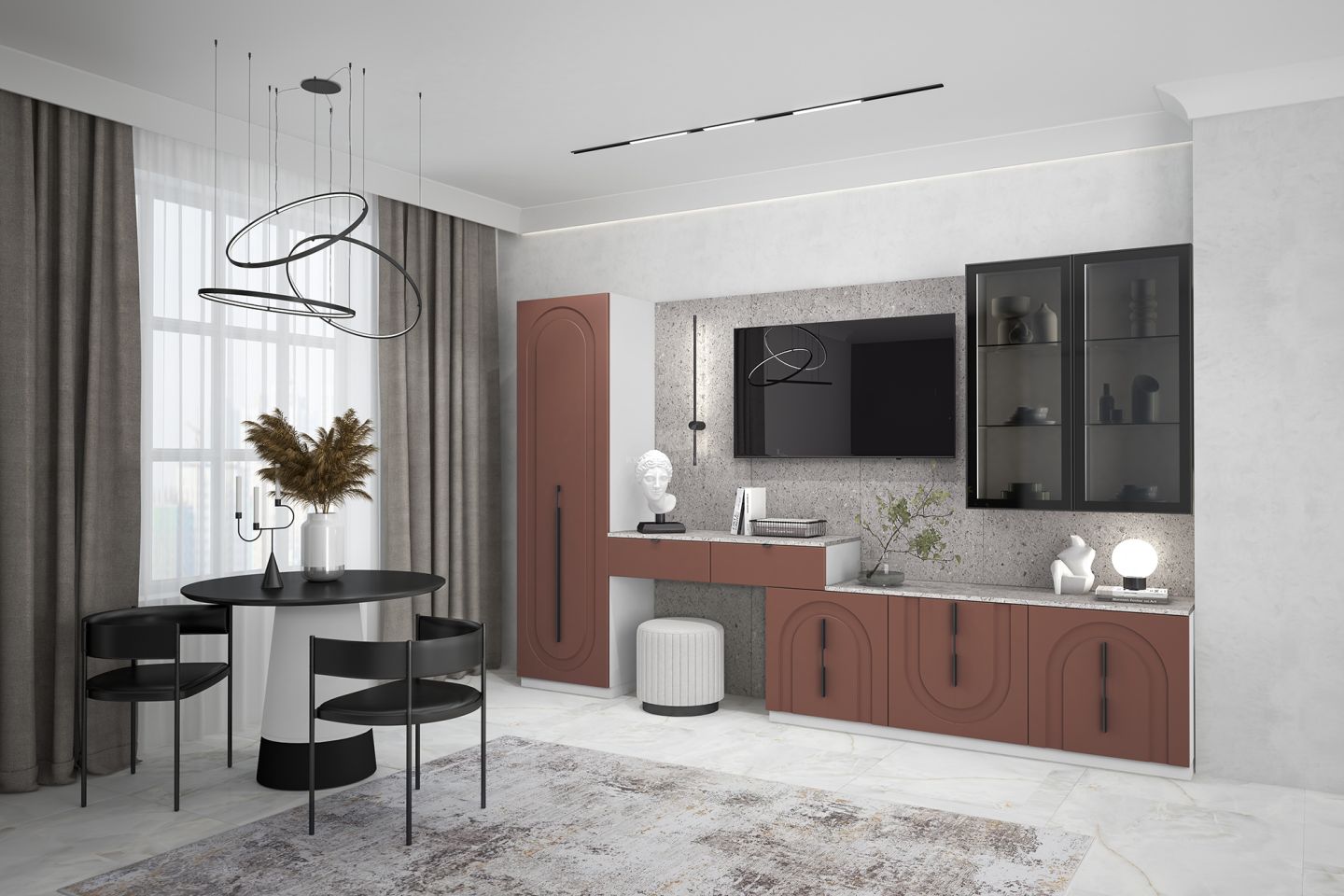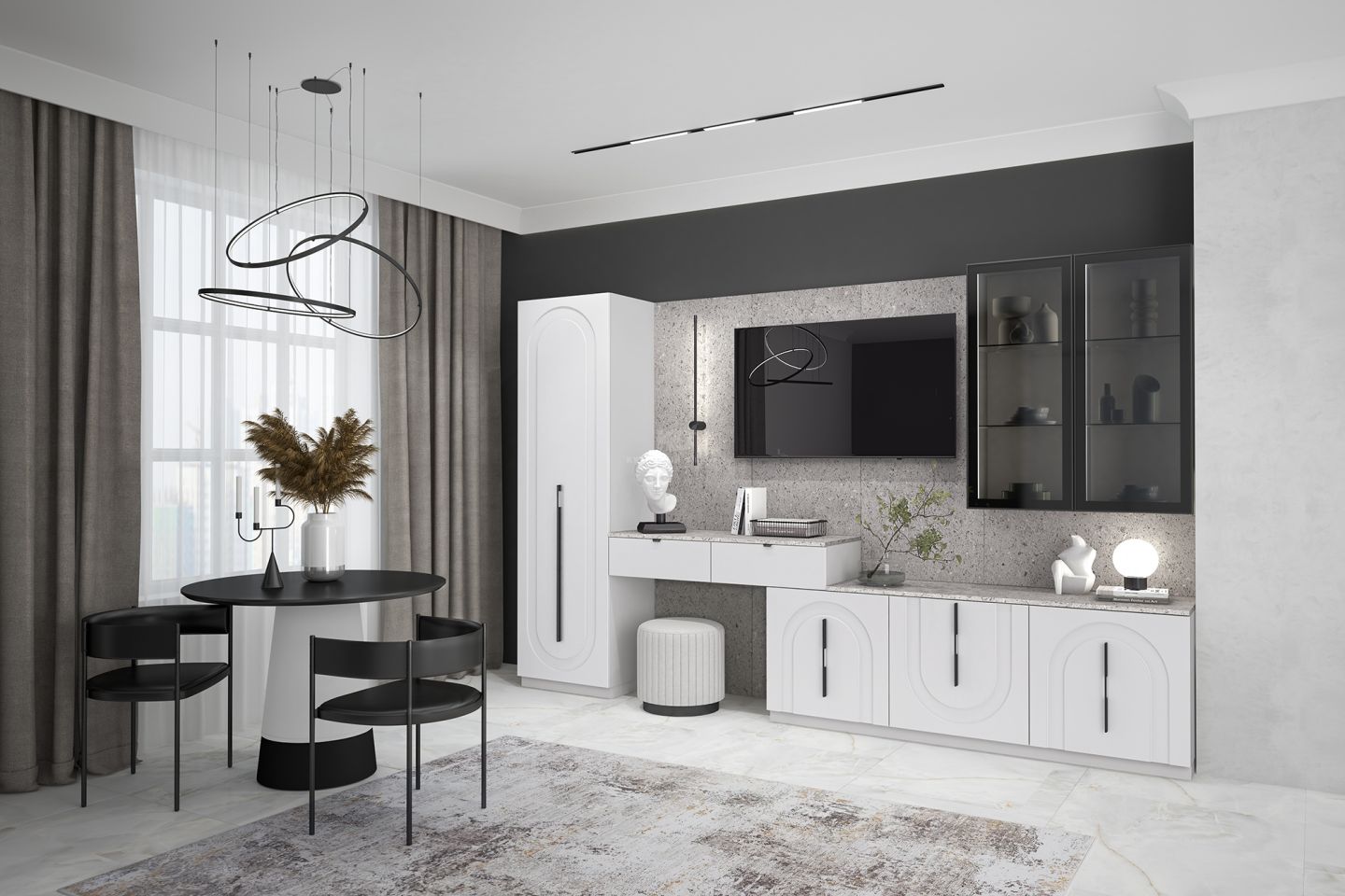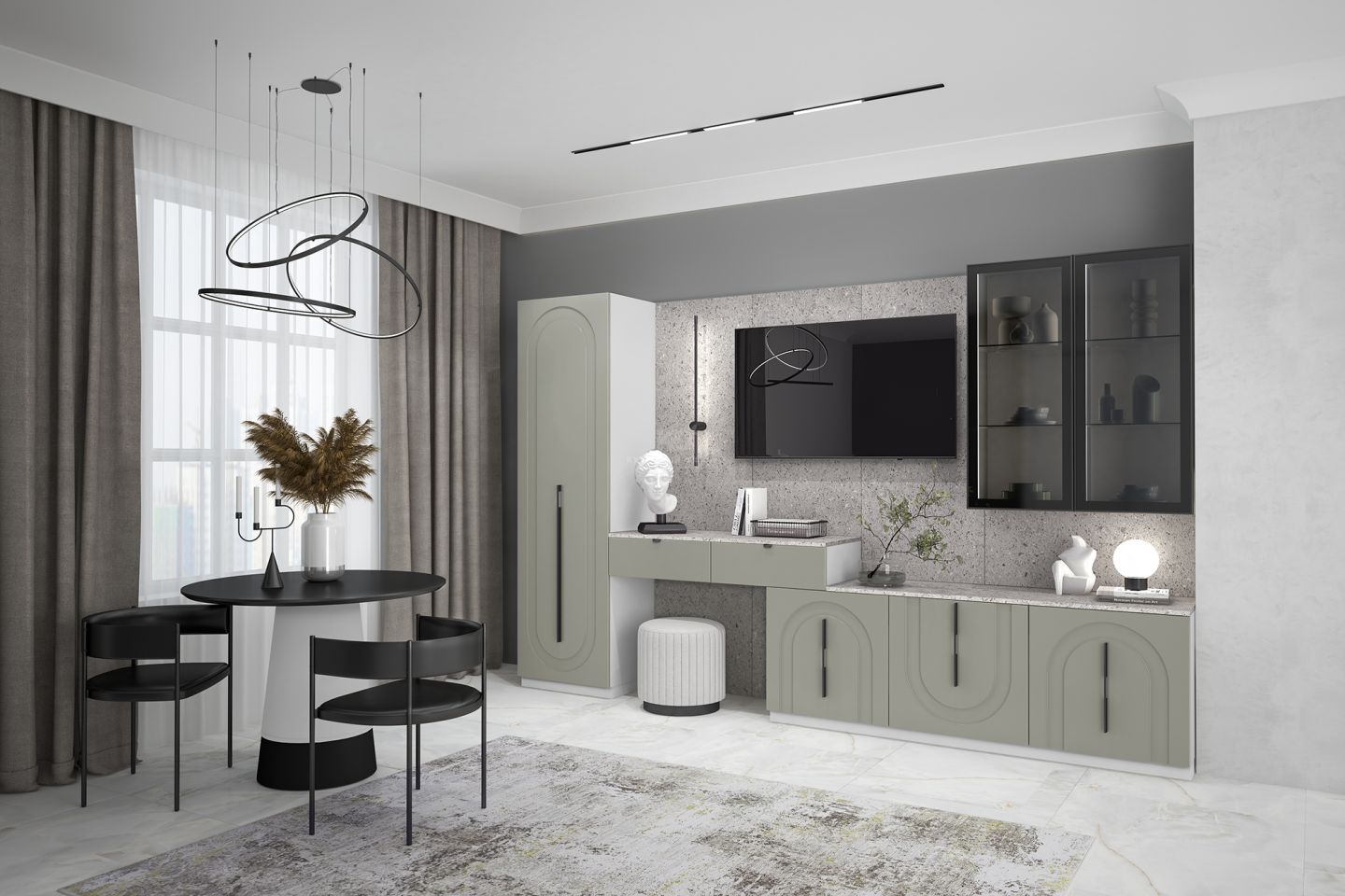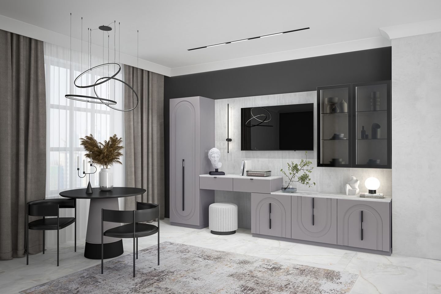 Арко — это больше, чем мебель. Это авторский подход к созданию жилого пространства, в котором каждая деталь продумана с инженерной точностью: мягкий матовый блеск фасадов, эргономичные вытянутые ручки, удобная система хранения, способная скрыть от глаз все лишнее. Здесь можно разместить книги, коллекции предметов искусства, технику, декор — при этом визуальная чистота и архитектурная цельность будут сохранены. Эта гостиная как галерея: она подчеркивает вкус хозяина и создает атмосферу интеллектуального уюта.