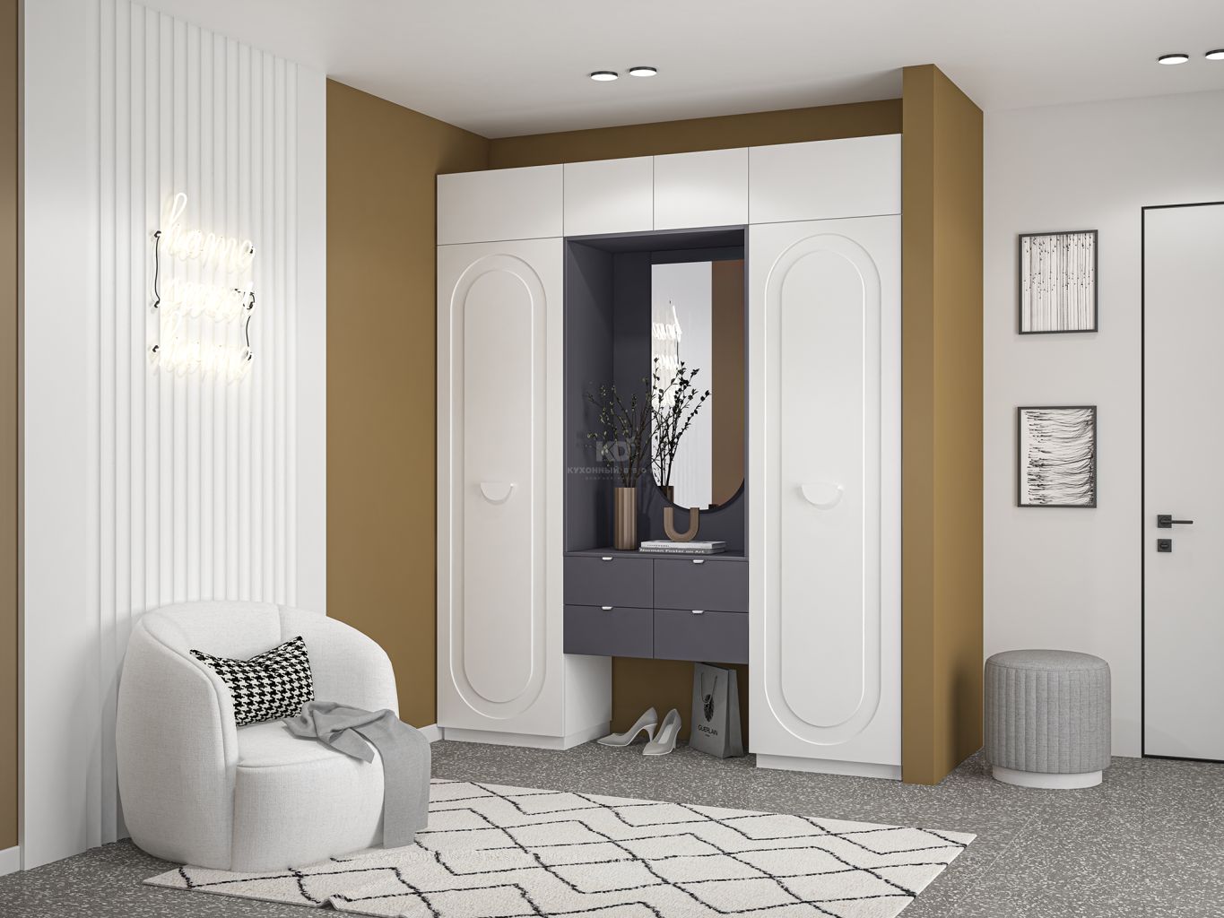 Прихожая Арко — приветствие вашего дома в фирменной эстетике линейки Арко. Два стройных пенала образуют архитектурную раму, а между ними — симметричная парящая тумба на четыре вместительных ящика.