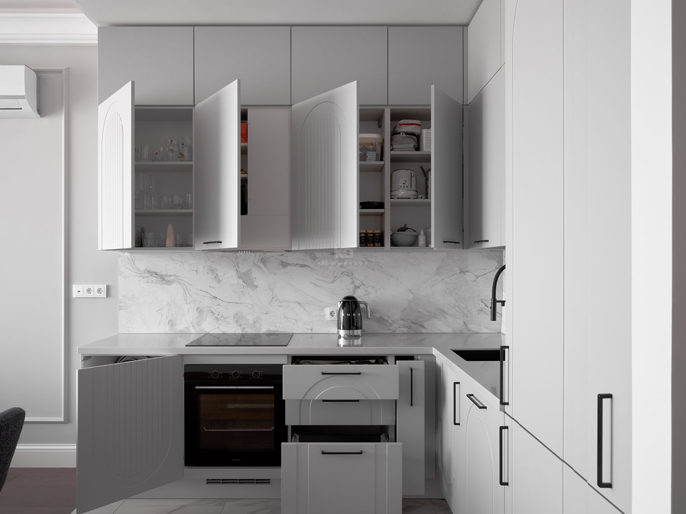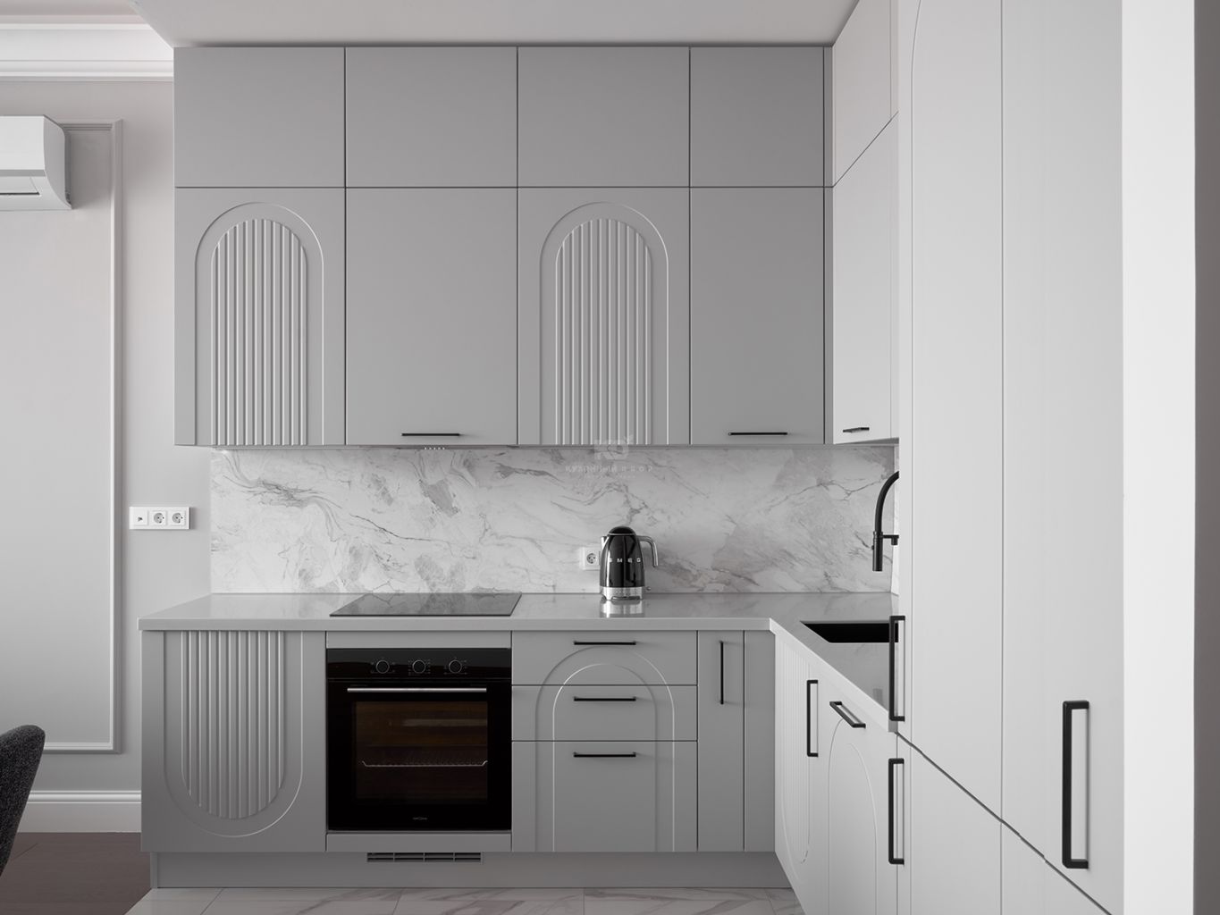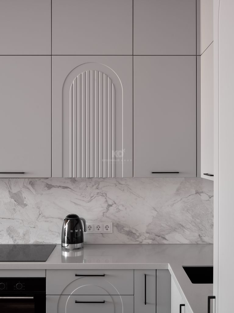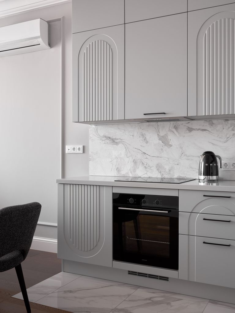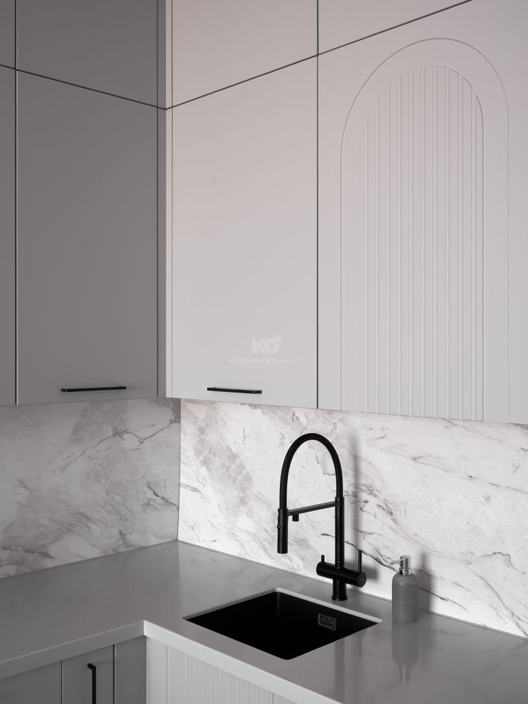 Столешница и фартук с текстурой под мрамор привносят в облик кухни природную роскошь. Холодные прожилки камня перекликаются с серым цветом фасадов, создавая единую композицию. Завершающий штрих — изящная черная фурнитура и смеситель. Тонкие графичные ручки и матовый кран работают как ювелирные украшения, подчеркивая неоклассический характер кухни и делая её образ современным и «острым».