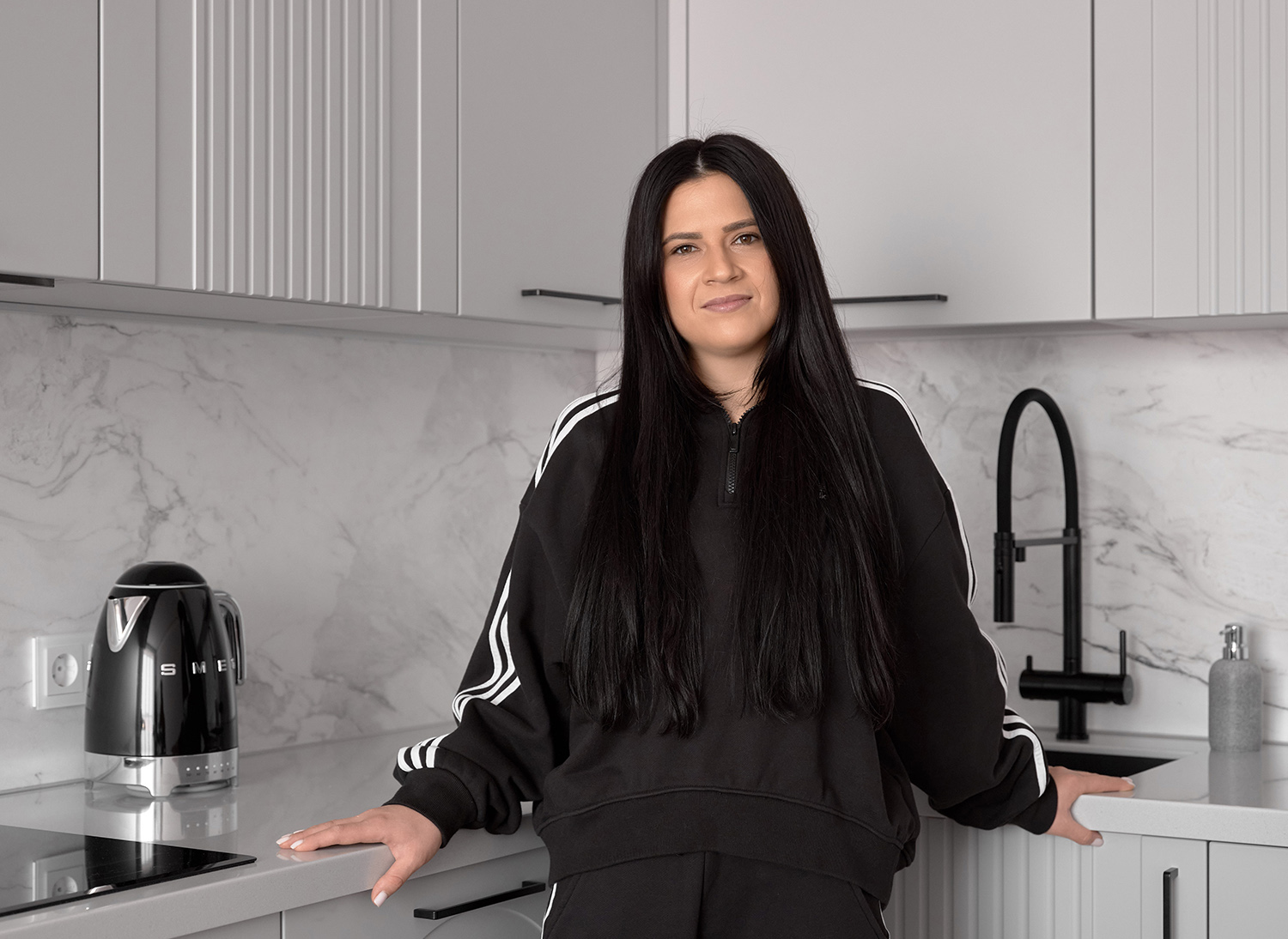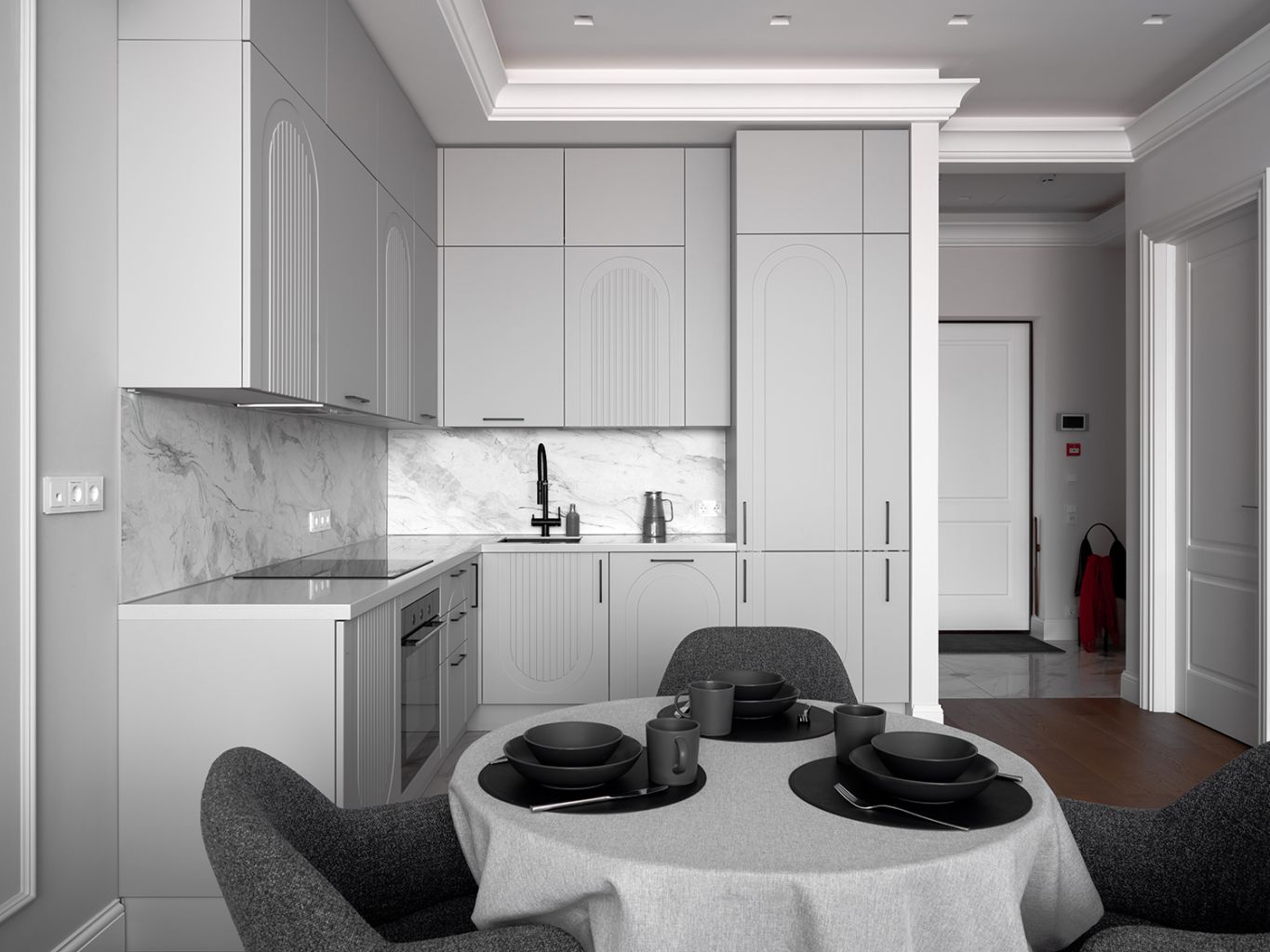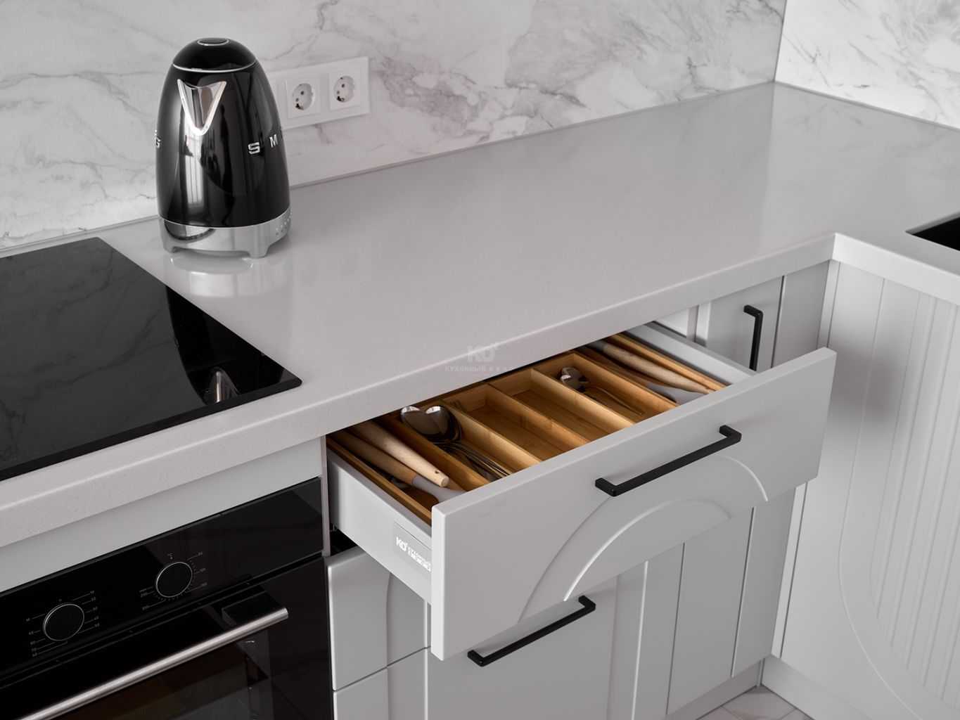 Столешница и фартук с текстурой под мрамор привносят в облик кухни природную роскошь. Холодные прожилки камня перекликаются с серым цветом фасадов, создавая единую композицию. Завершающий штрих — изящная черная фурнитура и смеситель. Тонкие графичные ручки и матовый кран работают как ювелирные украшения, подчеркивая неоклассический характер кухни и делая её образ современным и «острым».