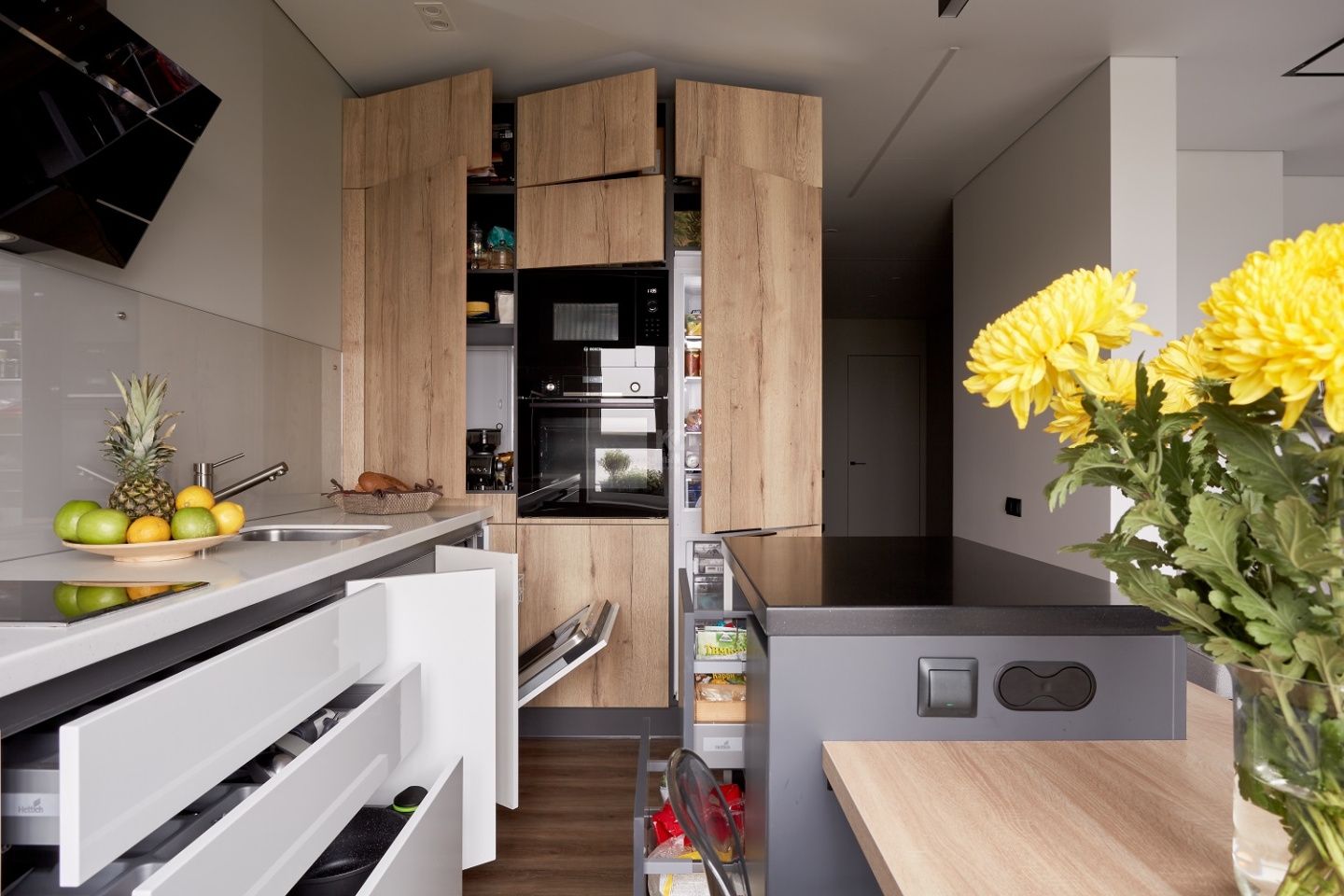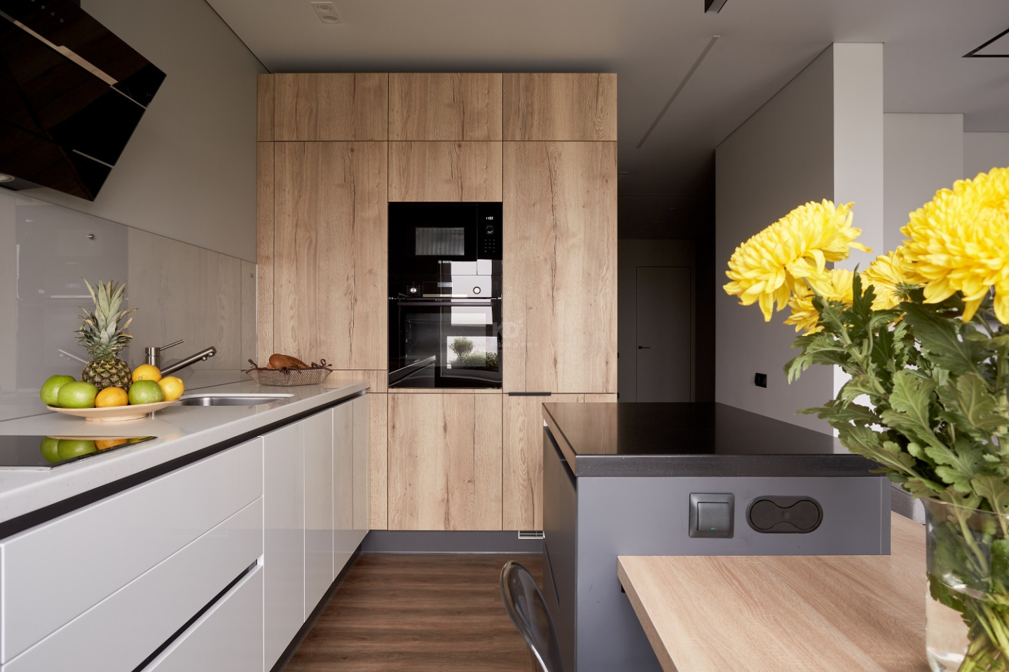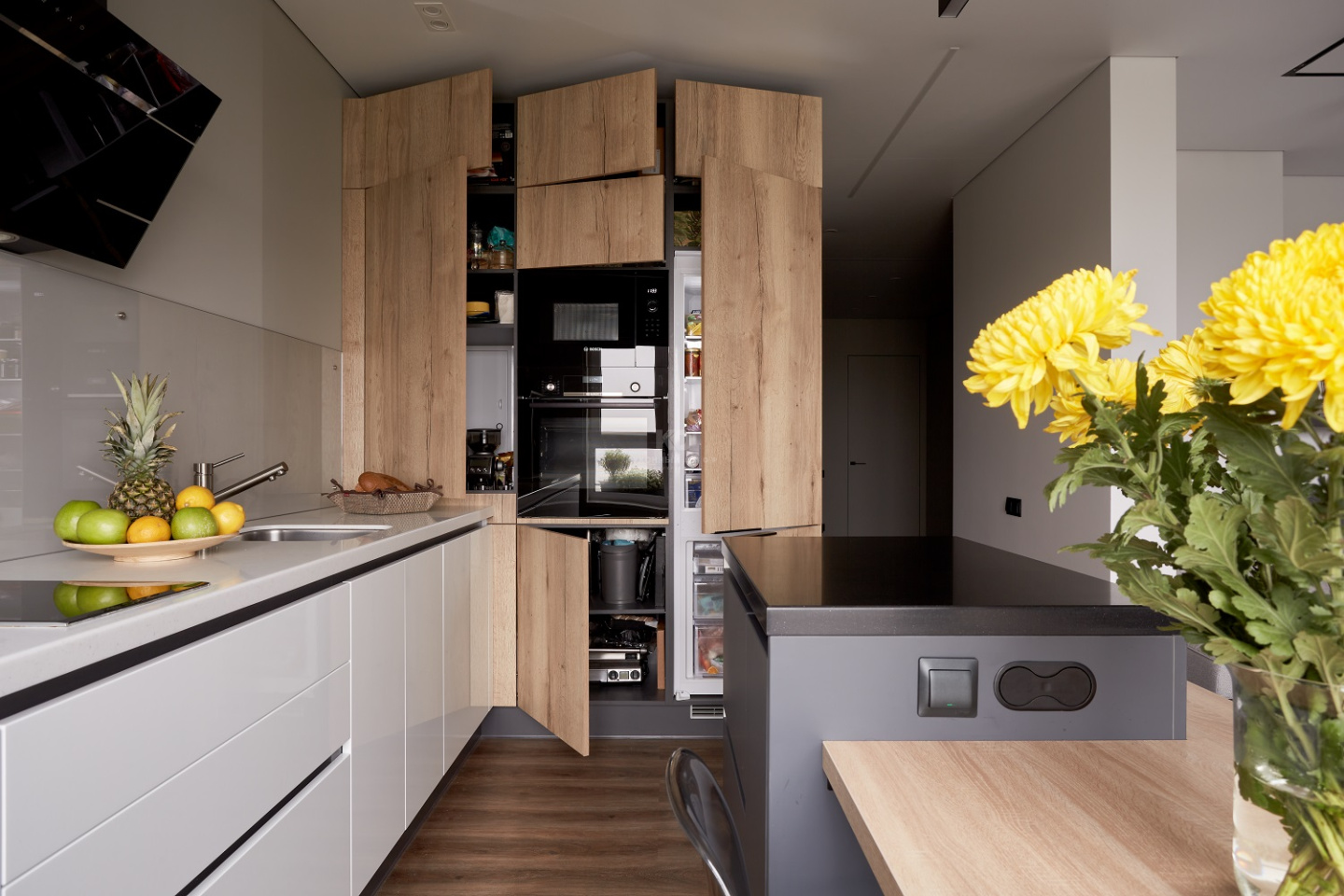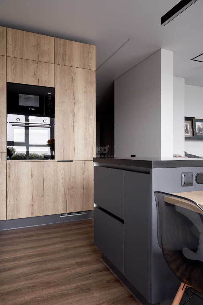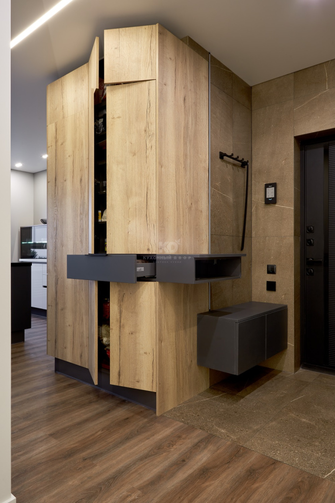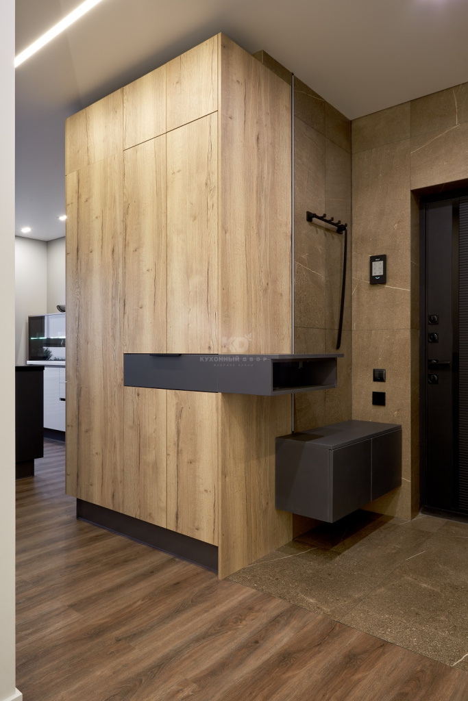 Кухня наполнена мощной энергетикой, однако выглядит удивительно лёгкой. Секрет прост: грамотная компоновка и правильное сочетание цветофактур! Так, корпус и фасады высоких пеналов здесь имеют фактуру древесины с неповторяющимся рисунком. Эти фасады достались проекту от модели «Стоун Вуд». Они созданы из лёгкой и долговечной экоплиты, которая в совершенстве имитирует натуральные текстуры визуально и тактильно. Кстати, зона, выполненная под дерево, является ещё и частью прихожей. Подробнее об этом – в видеоотзыве хозяйки!