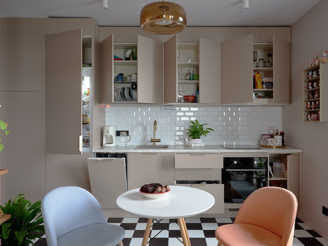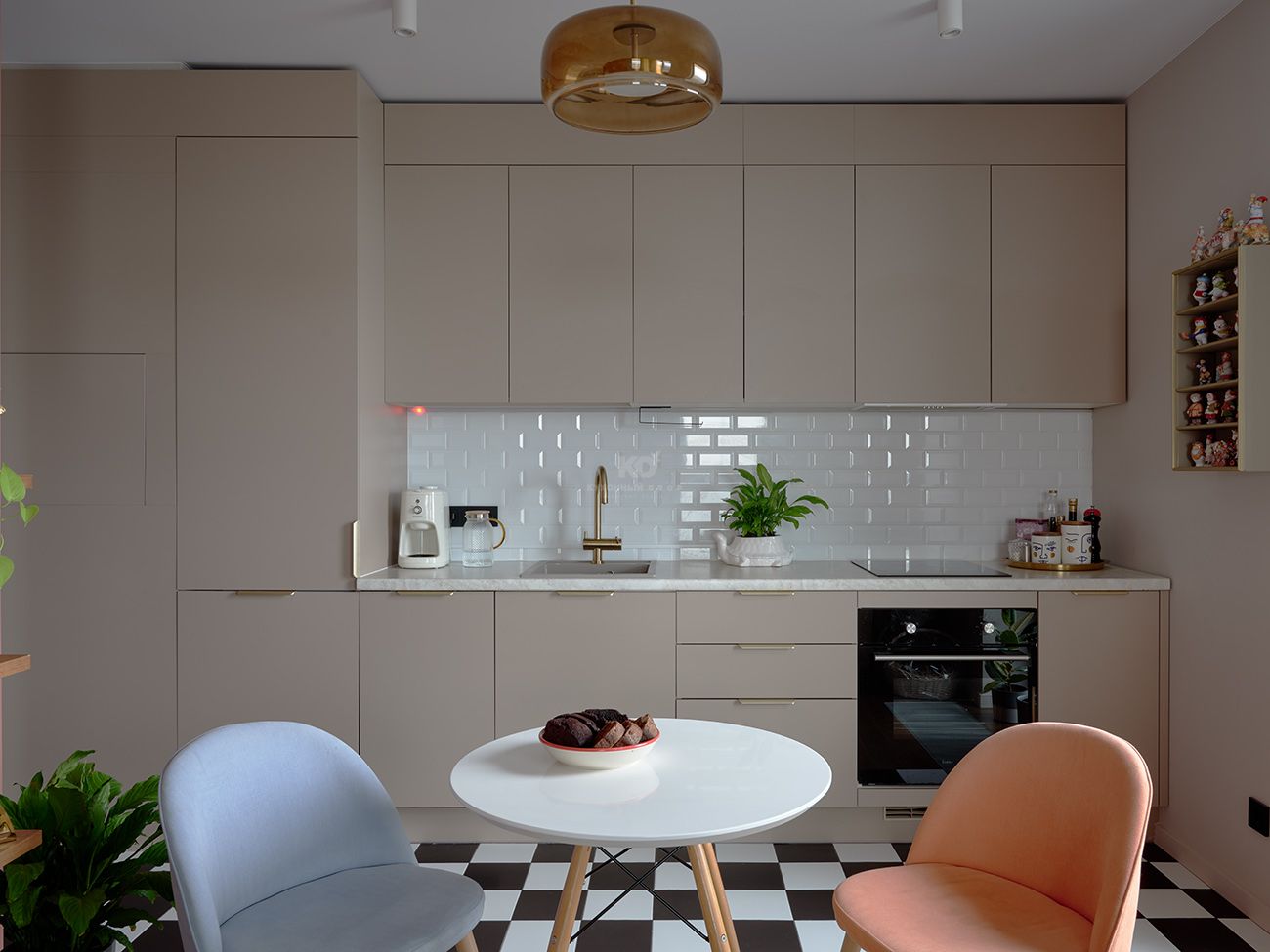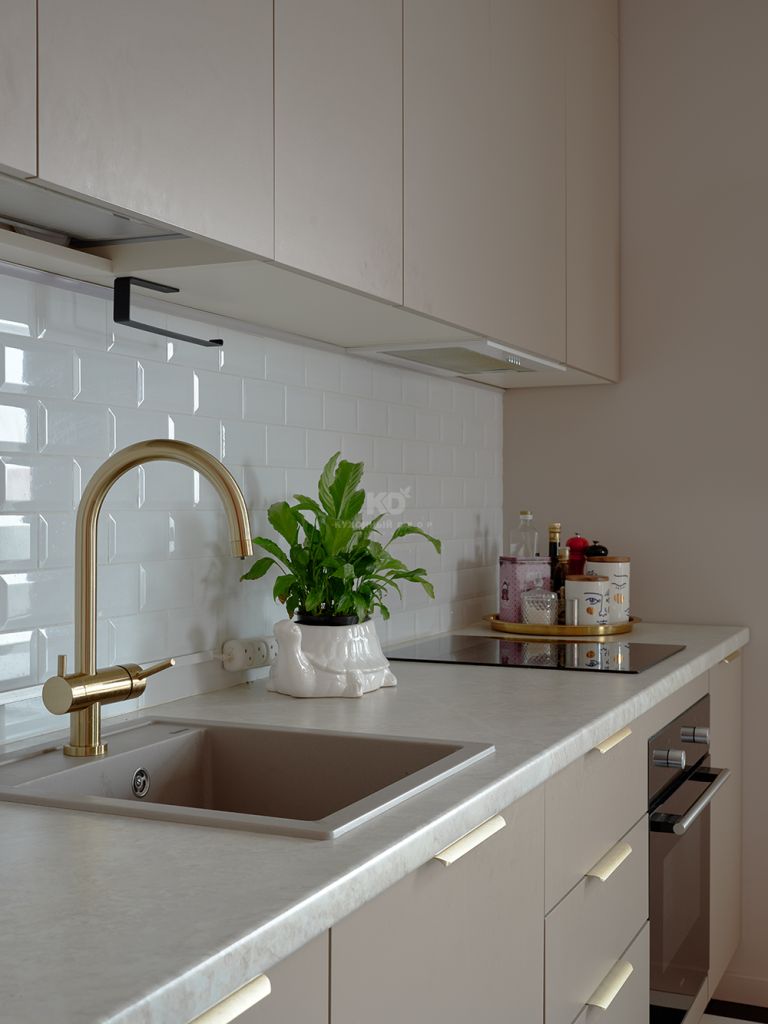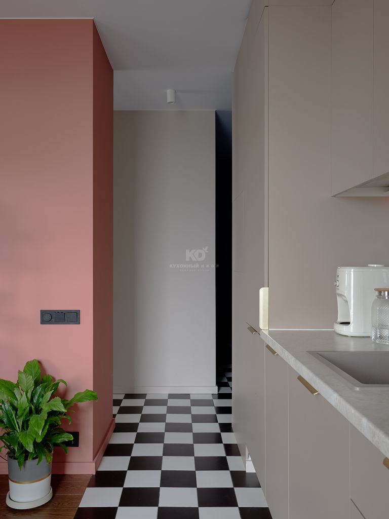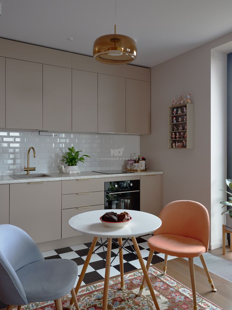 Перед вами наша легенда Стоун Колор. Модель, которая каждый год подтверждает, что список бестселлеров КД покидать она не планирует. Её приглушенные кашемировые фасады привносят баланс в смелую цветовую палитру квартиры. А в качестве деликатных акцентов выбрана фурнитура под матовое золото. Прямая кухня до потолка позволила максимально задействовать пространство — без визуального шума и случайных деталей. Благодаря этому стена выглядит как цельная монолитная конструкция, в которой всё подчинено логике и удобству. Многочисленные зоны хранения аккуратно скрыты за матовыми фасадами и не перегружают интерьер. В центре внимания насыщенная жизнь хозяйки, а не атрибуты быта!