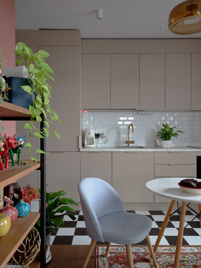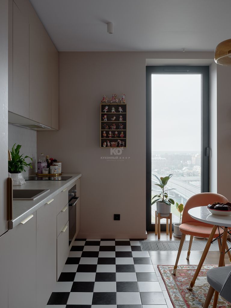Даешь бой скуке и стандартным решениям! Это девиз Кристины Петровой — хозяйки этой яркой и контрастной квартиры. Она сочетала пыльно-розовые и -голубые стены, шашечки на полу и мебель от КД. Взболтала. И получила идеальное гнёздышко для себя, своего кота и пары попугаев-неразлучников.