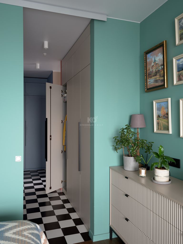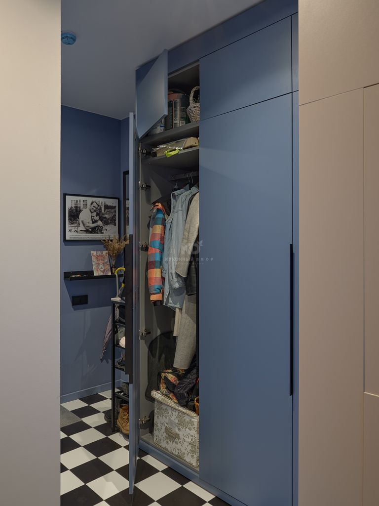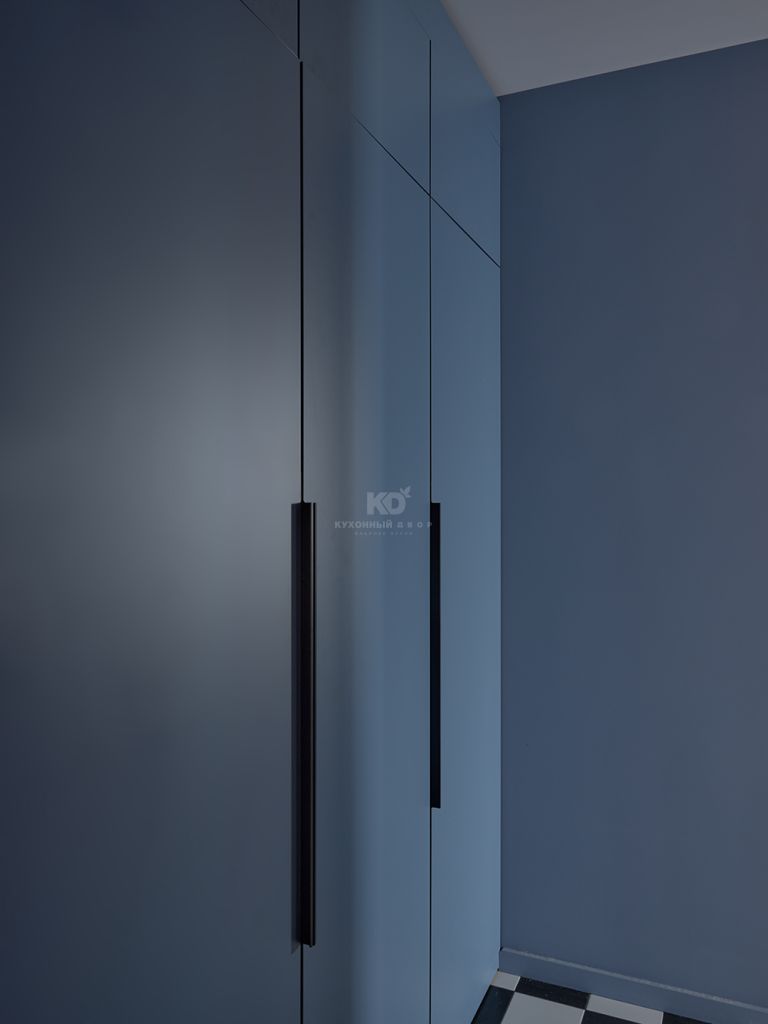 Но кухня Стоун Колор не единственная от КД в этой квартире! Четыре полноразмерных шкафа встроены в ниши в зоне прихожей и у спальни. В одном находятся средства и техника для уборки, во втором — верхняя одежда и обувь, а в третьем и четвертом разместился гардероб Кристины. Круговая планировка квартиры задала особые требования ко всей мебели: ни один элемент не должен был ломать маршрут движения или перетягивать на себя внимание. Именно поэтому кухня и шкафы выполнены в единой стилистике — они как будто растворяются в пространстве, поддерживая его ритм и архитектуру.