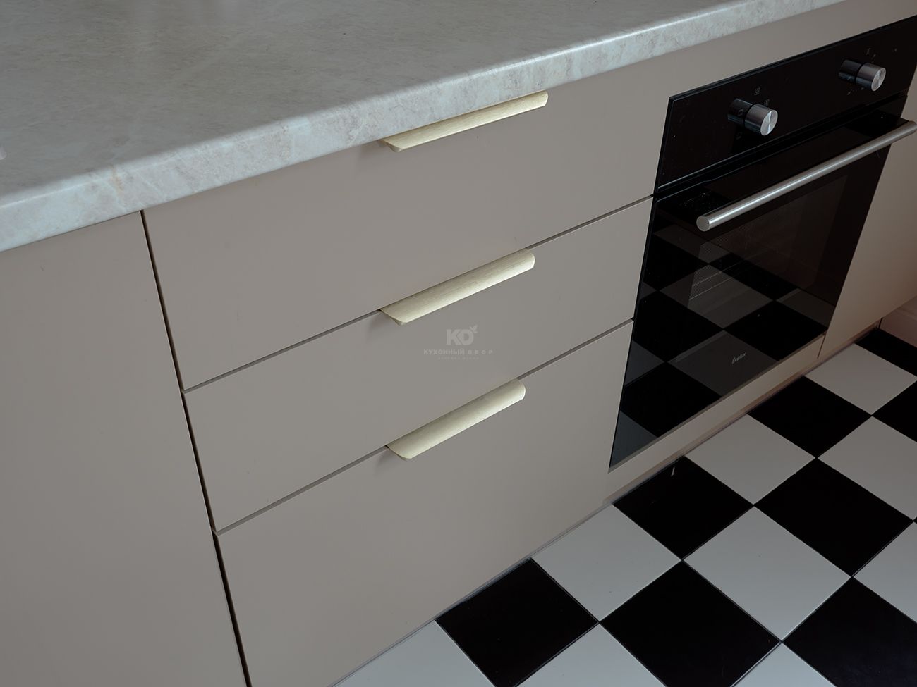 Кухня Стоун Колор здесь работает не только как зона готовки, но и как спокойный фон для жизни. Она не спорит с цветом стен и графикой пола, а собирает интерьер в единое целое. Матовые поверхности мягко рассеивают свет, делая пространство визуально теплее и глубже.