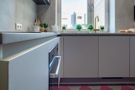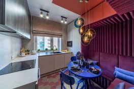 Зона 3 – сочный инжир. Сочности и комфорта хватит на всех! Кухня плавно перемещается в лаунж-зону, продолжаясь в фасадах цвета мякоти инжира. Эта часть комнаты просто создана для того, чтобы встречать гостей и наслаждаться вкусными блюдами!